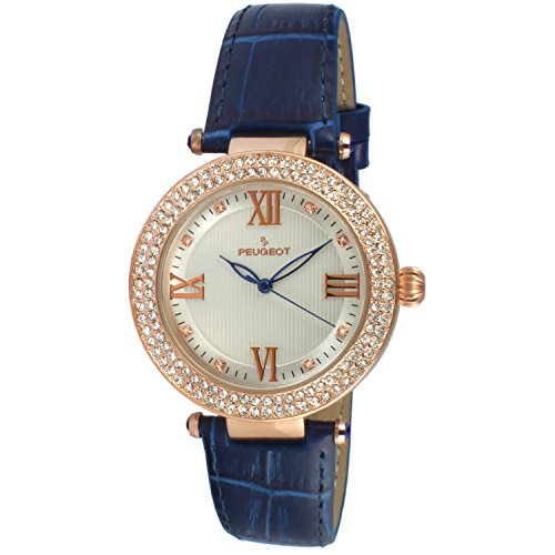 This elegant evening watch from Peugeot features a double row crystal accented bezel with a lovely silver textured dial. The unique blue hands match the blue cabochon T-bar end caps. Backed by a limited lifetime warranty by Peugot