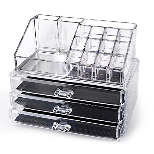 Studio : Home-it Publisher : Home-it Binding : Home Product Description This acrylic jewelry makeup 3 Drawer organizer is perfect for organizing lip liners, eyeliners, makeup, lip glosses and jewelry and more . It's a space saving accessory that keeps your makeup neat and organized. Regarding Acrylic : Acrylic is a useful, clear plastic that resembles glass. But it has properties that make it superior to glass in many ways. It is many times stronger than glass, making it much more impact resistant and therefore safer. Acrylic also insulates better than glass, potentially saving on heating bills. Adding to this favorable array of properties, a transparency rate of 93% makes acrylic the clearest material known. Very thick glass will have a green tint, while acrylic remains clear. Note : 1,Although it has a hard and clear surface, please avoid sharp scratch to keep its aesthetic. 2, Acrylic also insulates better than glass or plastic, but please don't close to the source of ignition to avoid damaging. 3, Cosmetic organizer isn't the Anti-Pressure product, please don't place too heavy articles. 0