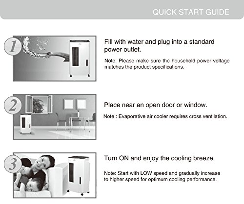 - Feature : BEST FOR HOT DRY CLIMATES, WHERE THE HUMIDITY IS LOW / Uses significantly less electricity than an Air Conditioner in a room up to 100 sq. ft. / Non-compressor system cools naturally, efficiently and inexpensively (150 CFM air flow) / Used with open windows and doors, no permanent installation required / 1.8 gallon water tank with fill door, water level indicator and low water alarm