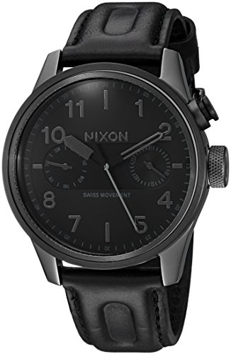 Handle any terrain in refined style with the adventure-inspired Nixon® Safari Deluxe Leather watch! Swiss quartz 3 hand movement with day and date function, crown placement at 3 o'clock and date pusher at 2 o'clock. The dial features applied hour indices and seconds track on the concave ring, a underlayer pill shaped subdial with date function at 2 o'clock and the day function at 9 o'clock and custom molded hands. Case:• 100 meter/10 ATM custom stainless steel case with hardened domed mineral crystal• Custom fixed Stainless steel bezel• Custom inner stainless steel bezel ring with knurled texture on the sidewall• Screw bar lugs• Stainless steel double gasket stainless steel crown with knurled texture and enamel fill• Stainless steel screw down caseback Tapered custom Horween leather strap with custom solid stainless steel buckle closure. Imported. Measurements: Case Height: 43 mm Case Width: 43 mm Case Depth: 13 mm Band Width: 6⁄7 in Band Circumference/Length: 9 1⁄4 in Weight: 3.4 oz This product may have a manufacturer's warranty. Please visit the manufacturer's website or contact us at warranty@support.zappos.com for full manufacturer warranty details.Feature
