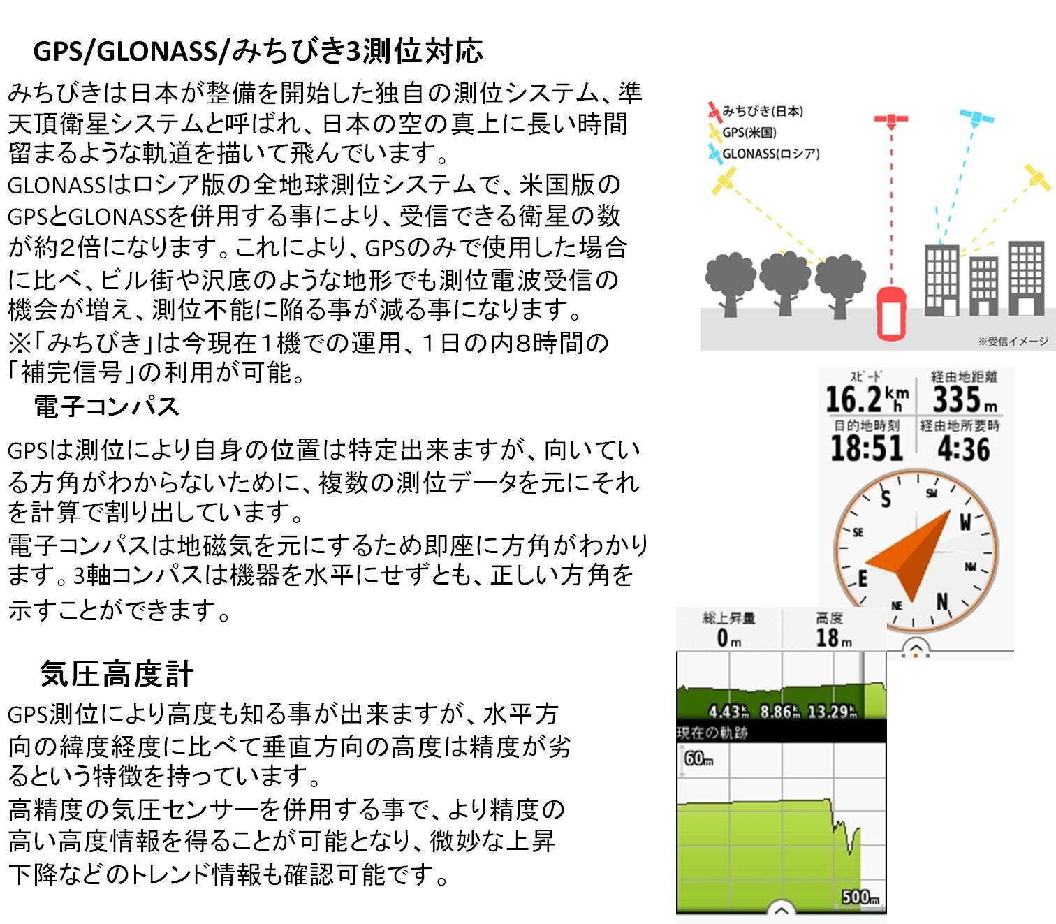 The eTrex Touch has a built-in GPS function that Garmin boasts (three position correspondence) and a three-axis electronic compass showing an accurate direction even when it is inclined, and a barometric altimeter that does not miss a fine pressure change.