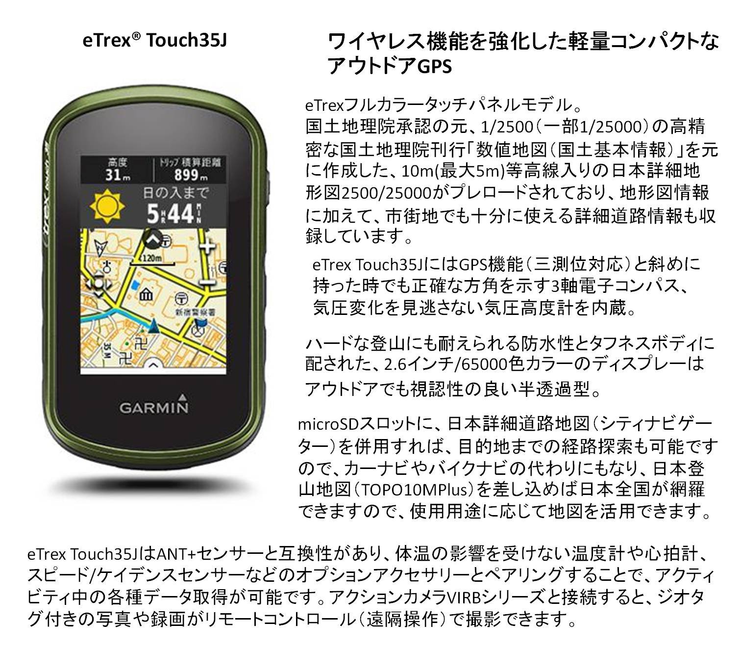 eTrex Touch 35J is compatible with ANT + sensor, and by pairing with optional accessories such as thermometer, heart rate monitor, speed / cadence sensor, etc. which are not affected by body temperature,