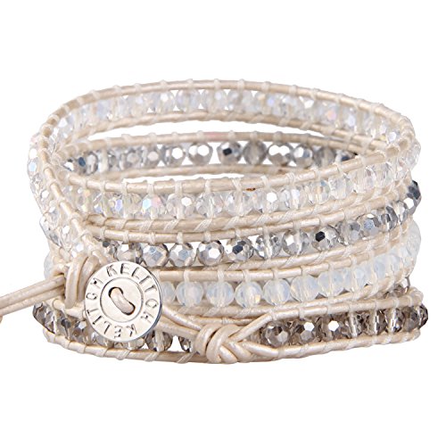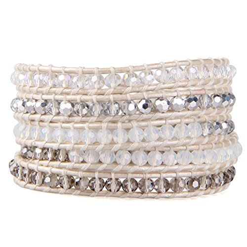-. Title : KELITCH Crystal Gray Beaded 5 Wrap Bracelet On Lvory Leather Handmade Jewelry