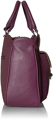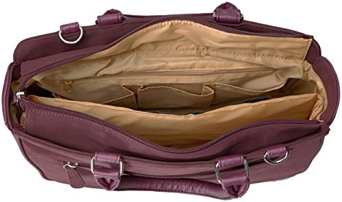 Natural Suede faux leather w/pebble grain trim. Shoulder straps w/brushed nickel hardware. Exterior front iPad pocket. Full top zip closure. Interior padded.