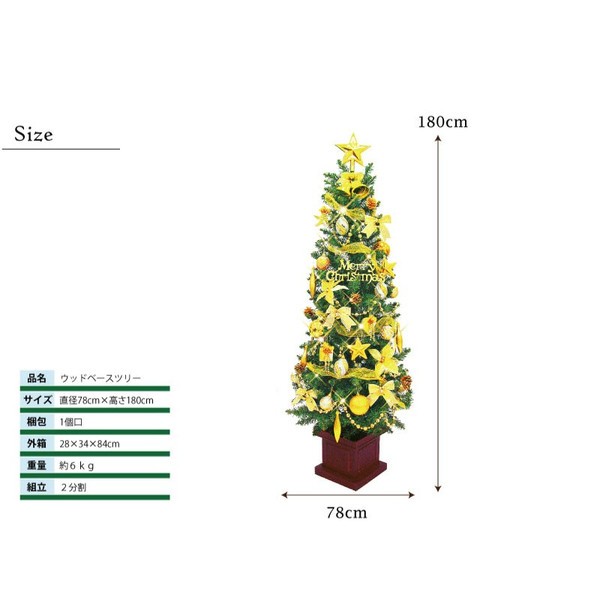 ウッドベーススリムツリーセット180cmサイズ 直径78cm×高さ180cm梱包 1個口外箱サイズ 28×34×84cm重量 約6kg組み立て式 2分割 ★店長の一言★当店不動の人気No1ツリーのオーナメントセットです!スリムなスタイルでかさばらず収納の際も分割できるのでさらにコンパクトで収納スペースいらず。ライトや飾りがたっぷり付いてのお値段です!