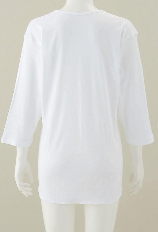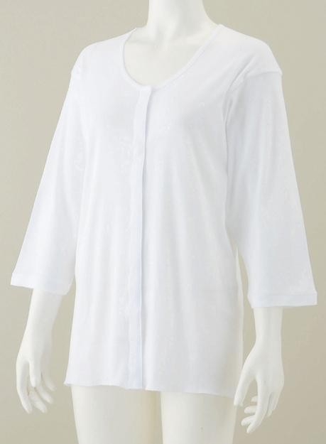 | 極薄プラスチックホックでホックが内側に隠れ外見がすっきりします。軽い力で着脱が楽にできます。袖口はゆったりめで、点滴や注射にも対応しやすい設計です。肩部分の縫い目を平らにした縫製で凹凸の違和感を無くしました。後丈長めの設計で、動いても裾がはだけにくくなっています。 |