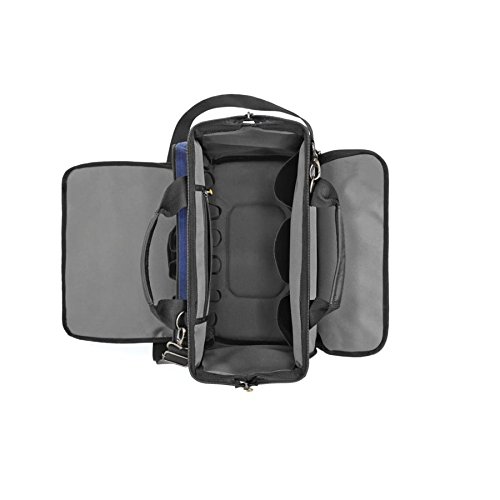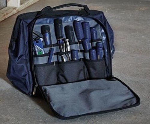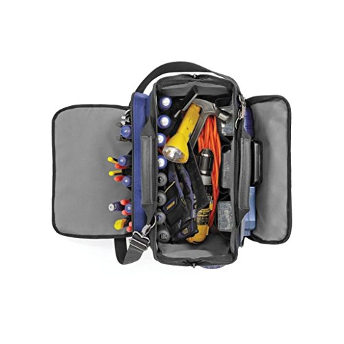 1680d heavy-duty construction for long life • Premium padded strap for comfortable transport when fully loaded • Zippered interior pouch for secure small part storage • Hi-Vis zippers and pocket accents • 35 pockets and slots for tool organization