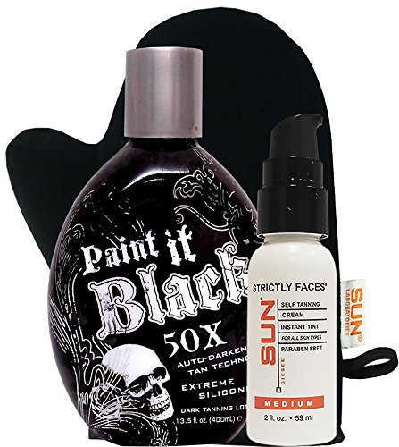 Millennium Tanning Paint It Black 50X,13.5 NEW Unique Auto-Darkening Tan Technology delivers extreme dark bronze tanning results through its super luxurious silicone emulsion blend. Experience stunning dark tan color and ultra moisturization that lasts all day. Accelerating, Bronzing, Skin Firming, Silicone Emulsion Fragrance: Fresh and Clean Cotton Blossom. Suitable for all ages as this product does not contain a tingle!!!