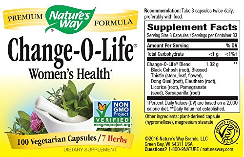 Studio : Nature's Way Publisher : Nature's Way Binding : Health and Beauty Product Description Nature's Way Change-O-Life formula is a blend of Black Cohosh and other popular women's supplements for a powerful synergy. This is a popular women's formula, with herbs traditionally used for menopausal support. 0