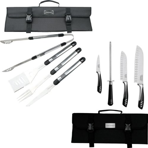 Studio : Trademark GLB Publisher : Trademark GLB Binding : Kitchen Product Description Like those used on Bravo's top-rated Top Chef program, these knives features an ice-tempered stainless steel blade with precision cut sharpened cutting edge, hollow ground to reduce sticking and a full steel handle with seamless bonded and polished bolsters. Stainless Steel BBQ Set Product Features: Each Grill Tool is Made of Rust Resistant 420 Stainless Steel Parts for Long Lasting Durability, Aluminum Handles are Hollow Formed to Maintain a Comfortable, Working Temperature and Light Weight Spatula features a Bottle Opener, Serrated Edge and Tenderizer 19-inch Tong, 19.5-inch Spatula, 19.5-inch Fork, 17-inch Knife, 7-inch Santoku Knife, 5-inch Satoku Knife, 3.5-inch Paring Knife, Sharpening Rod, Nylon Carry Pouch, 5-Piece Stainless Steel Knife Set Features:- 7-inch Santoku Knife, 5-inch Satoku Knife, 3.5-inch Paring Knife, Sharpening Rod, Nylon Carry Pouch. 0