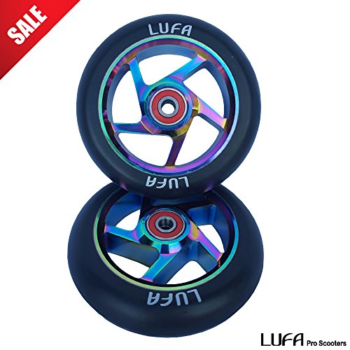 -. Title : 110mm LUFA Neo-Chrome Oil Slick Pro Scooter Wheels SET 2pc + Bearings Metal Core