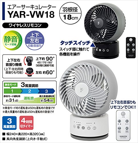 야마젠(YAMAZEN) 18cm입체수 흔들어 서큘레이터 (정음 모드 탑재)(리모콘)(풍량3단계) 터치 스위치식 타이머부 메탈릭 블랙 YAR-VW18(MB)