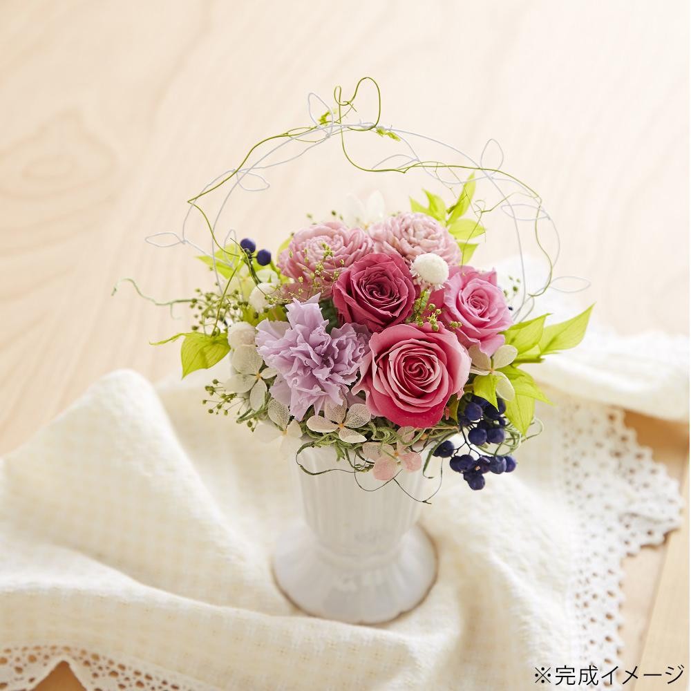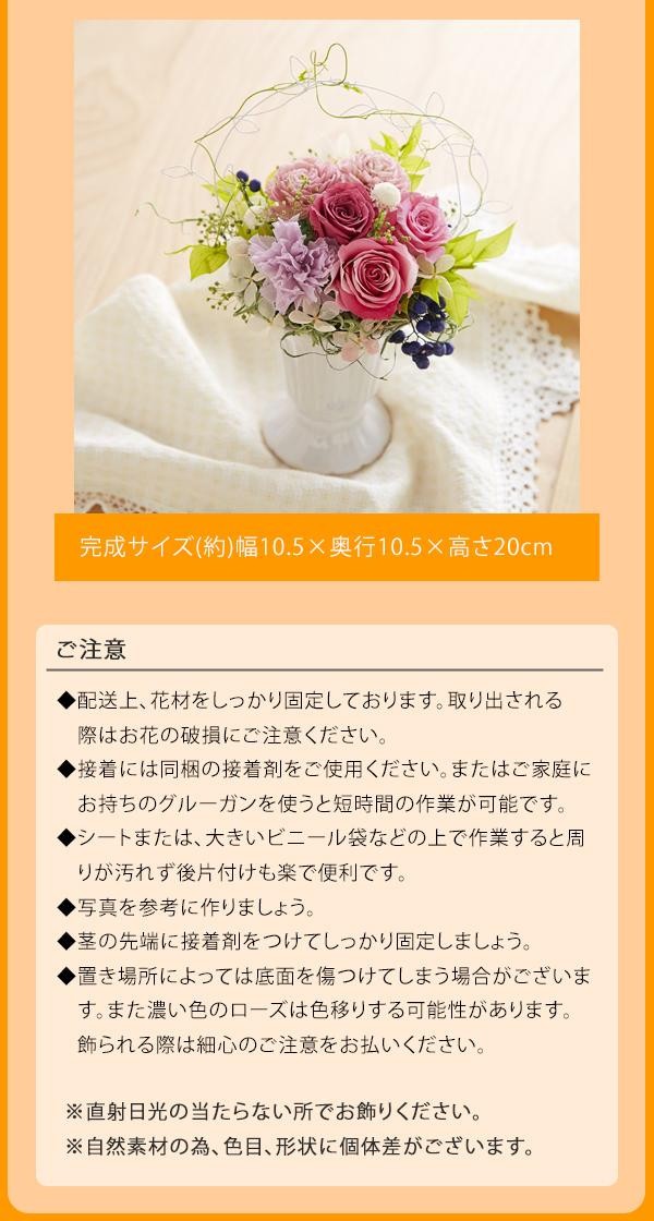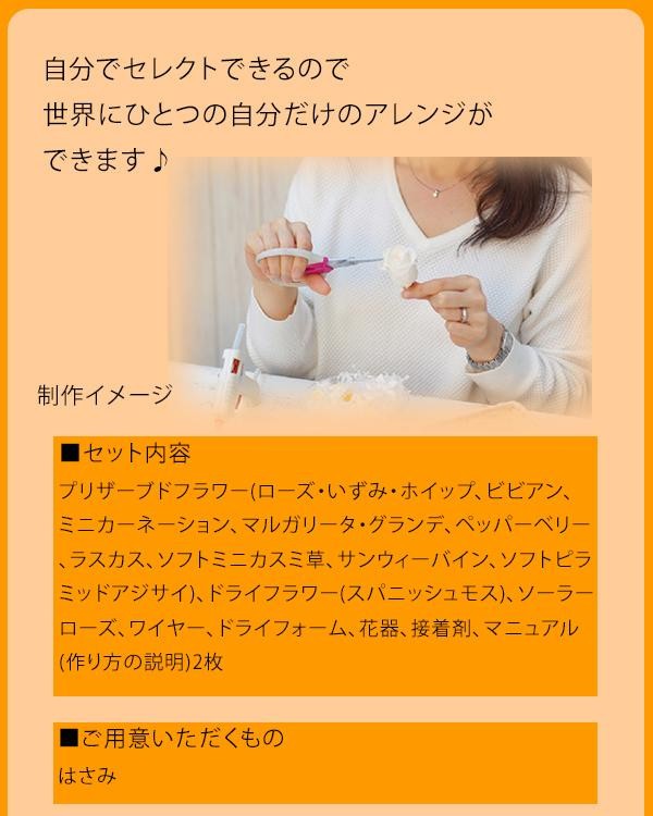 | セット内容 | プリザーブドフラワー(ローズ・いずみ・ホイップ、ビビアン、ミニカーネーション、マルガリータ・グランデ、ペッパーベリー、ラスカス、ソフトミニカスミ草、サンウィーバイン、ソフトピラミッドアジサイ)、ドライフラワー(スパニッシュモス)、ソーラーローズ、ワイヤー、ドライフォーム、花器、接着剤、マニュアル(作り方の説明)2枚 |