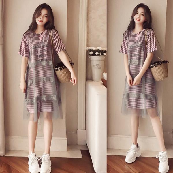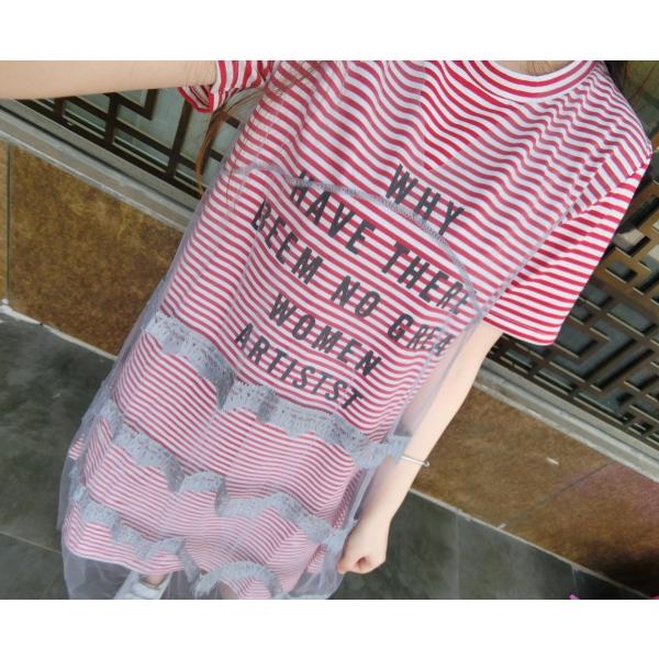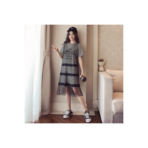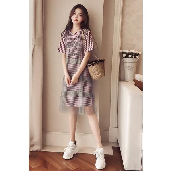 ストライプ柄のロンTワンピースとメッシュドレスのセットアップ。
