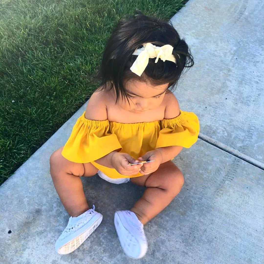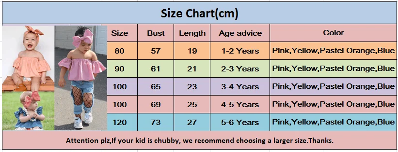 | Baby Girls Outfits Clothes T-shirt Tops+Bowknot Headband Set? High quality and Brand new 100% Main Color: Pink」ャYellow」ャPastel Orange」ャBlue New in Fashion Material: High-elastic material+Cotton Blend Attentionplz:Ifyourkidischubby」ャwerecomendchoosingalargersize」ャthanks. Please kindly refer to your kids actual height and the size chart before buying/bidding. Thanks. Package included: 1x Stylish Off Shoulder+Bowknot Headband Size Chart: ![]() There is 2-3% difference according to manual measurement. please check the measurement chart carefully before you buy the item. 1 inch = 2.54 cm Please note that slight color difference should be acceptable due to the light and screen. Preview Pink ![]() ![]() Yellow Pastel Orange ![]() Blue ![]() | |