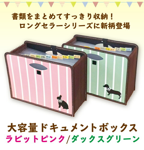 | 伸縮して自立する大容量のドキュメントボックスに、ラビットとダックスのかわいい2柄が新登場。A4サイズがすっぽり入り、かさばる書類をスッキリ収納・保管できます。請求書・領収書やお子様の宿題などの整理に。また、たっぷり13ポケットで月ごとの仕分けも可能。便利なインデックス付き/A4ヨコ/ドキュメントスタンド/ファイルボックス/ドキュメントファイル/ドキュメントケース/取説ホルダー |