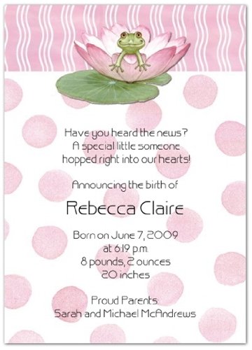 Studio : Storkie Express Publisher : Storkie Express Binding : Baby Product Product Description Birth Announcements: "Lily Pad on Pink" features a smiling frog sitting in a flower on a lily pad. The design is accented by a background of pink swirls at the top and 0