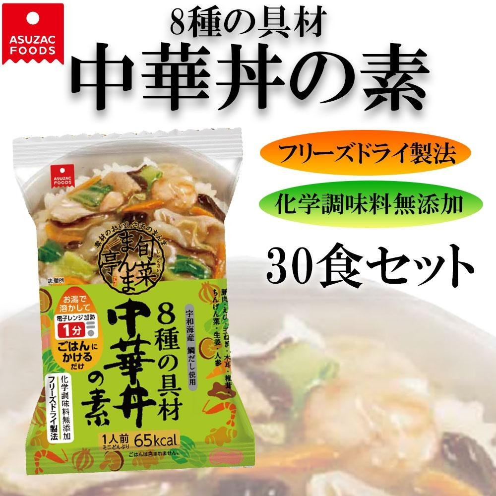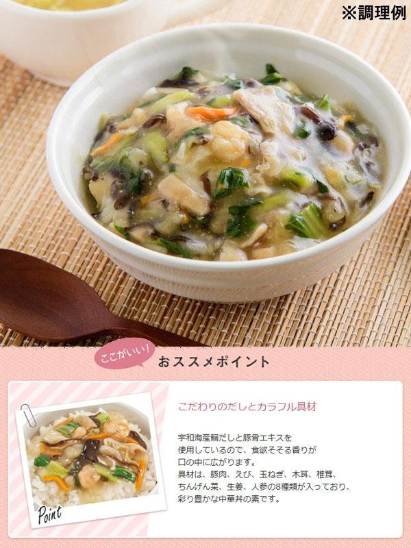 8種の具材(豚肉、えび、玉ねぎ、木耳、椎茸、ちんげん菜、生姜、人参)を使った具だくさんな中華丼の素です。宇和海産真鯛の出汁と豚骨エキスを使用し、素材のおいしさをそのままフリーズドライにしました♪アレンジ次第でご飯の上にかけるだけでなく、中華麺や、かた焼きそばの具にもオススメです。 |