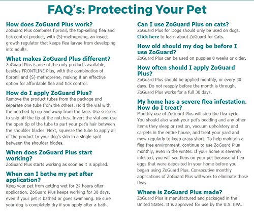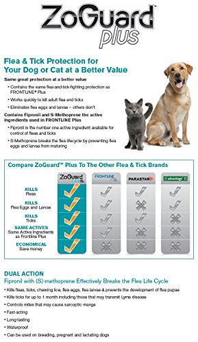Product DescriptionNew ZoGuard Plus for Dogs Safely and Effectively Kills Fleas, Ticks Chewing Lice with the same active ingredients as Frontline Plus. Made In The U.S.A.0