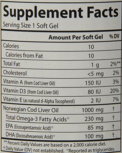 -. Feature : Promotes healthy heart, arteries, joints, brain-nerve function and bone strength / Provides the finest cod liver oil, naturally rich in EPA and DHA / Natural vitamin E added to each soft gel to protect the freshness of EPA and DHA / From the deep and unpolluted waters near Norway / Regularly tested using AOAC international protocols for potency and purity