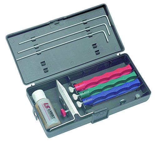 - Kit includes : knife clamp; 3 sharpening hones (coarse; med; fine); guide rods; oil