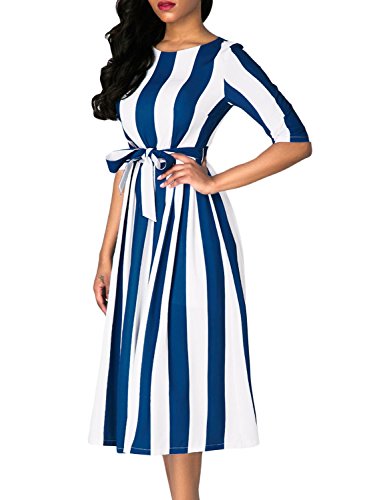 Dokotoo Womens Vintage Summer Ladies Half Sleeve Stripe Print 1950s Midi Skater Pleated Casual Dresses Blue Large