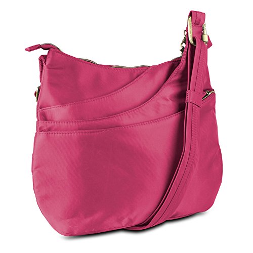 Keep all your personal belongings protected while you're on-the-go with the Travelon Anti-Theft Drape Pocket Crossbody. This bag gives you all the protection you need while you're out and about. It's made with slash-proof body panels and a slash-proof strap that even includes a locking carabiner, so you can secure your bag to a chair or table. The main compartment includes a built-in lock, plus 5 card slots and a passport slot with built-in RFID protection. There are then 4 additional pockets, three on the front and one on the back, giving you plenty of storage options for everything from chapstick to your water bottle. When you're ready to go, the adjustable strap makes it easy to wear the bag as a crossbody or shoulder bag.Feature
