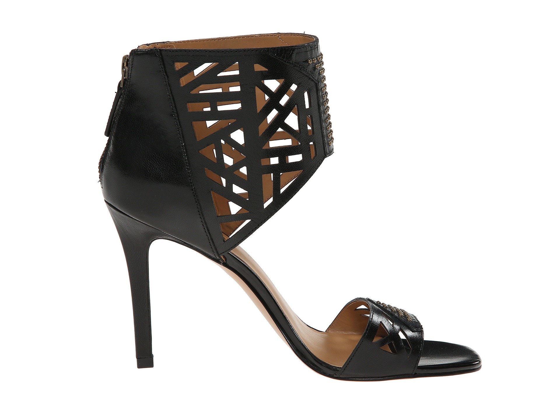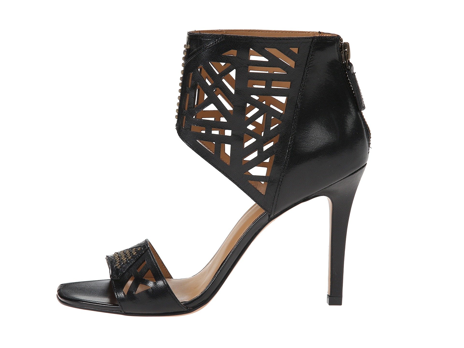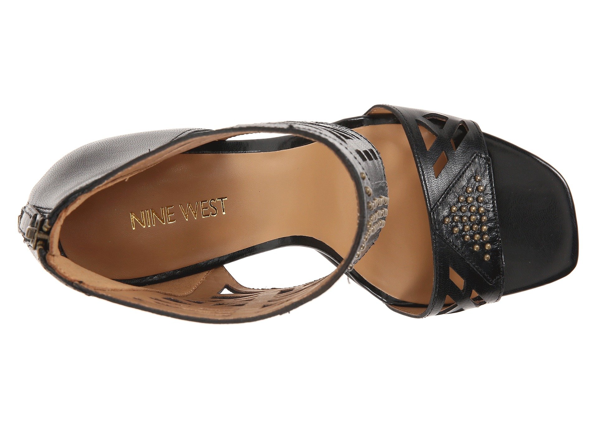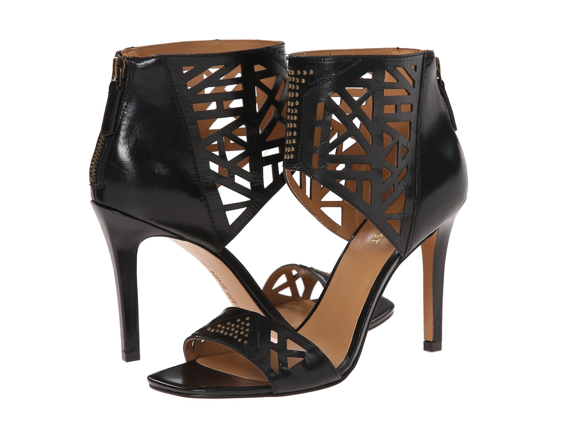 | Product Information SKU: #8591817Make a splash with these haughty heels!Back-zip closure.Leather upper with laser-cut panels and stud detail.Man-made lining.Lightly cushioned man-made footbed.Wrapped heel.Man-made sole.Imported.Product measurements were taken using size 9, width M. Please note that measurements may vary by size.Weight of footwear is based on a single item, not a pair.Measurements: Weight: 9 oz |