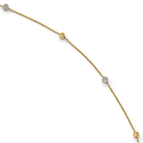 Indulge in a little bling for your leg with a shiny 14k two-tone gold anklet that features six diamond-cut 3mm beads stationed on a 1mm width cable chain finished with a spring ring clasp and 1-inch chain extender. It is adjustable in length from 9 to 10 inches. Made in ItalyFeature