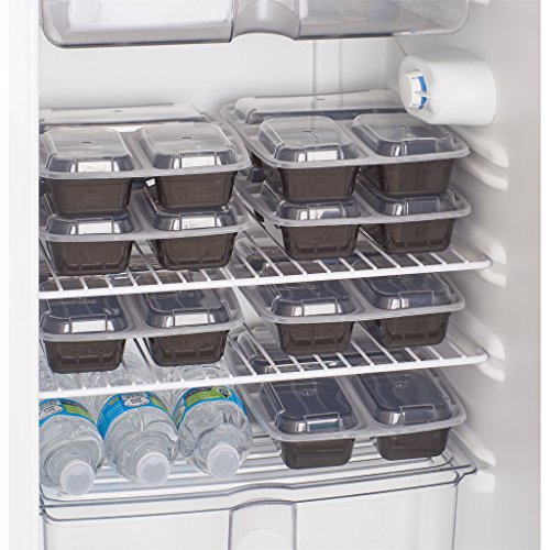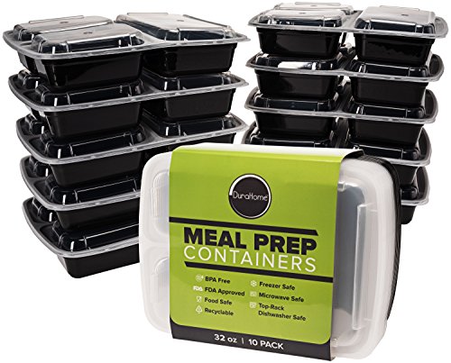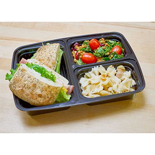 10 food containers and lids, 3 compartments each. Measurements: 9.25” x 7.5” x 1.75” deep. Lightweight, stackable and re-usable - the new Tupperware alternative