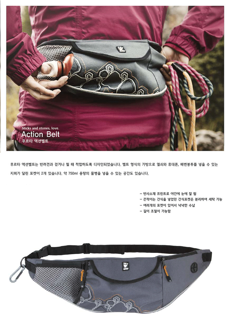 지퍼포켓 2개와 프론트 포켓이 있으며, 물병을 넣을 수 있는 휴대용 벨트형 가방