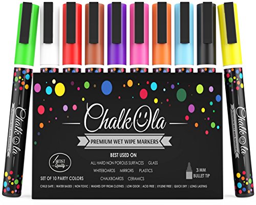 Chalkola feucht abzuwischende Marker sind LEBHAFT | STRAHLEND | SCHWUNGVOLL - Sie konnen auf folgenden Oberflachen verwendet werden: Einweckglaser, Keramik, Heimwerker-Projekte, zum Hinterlassen personlicher Nachrichten auf dem Spiegel & Kalender, auf Kreidetafeln, Fliesen, Metall, Plastik, Glasturen, Dankeskarten, Glitzeraccessoires, Speisekarten, in Pubs, Turnhallentafeln