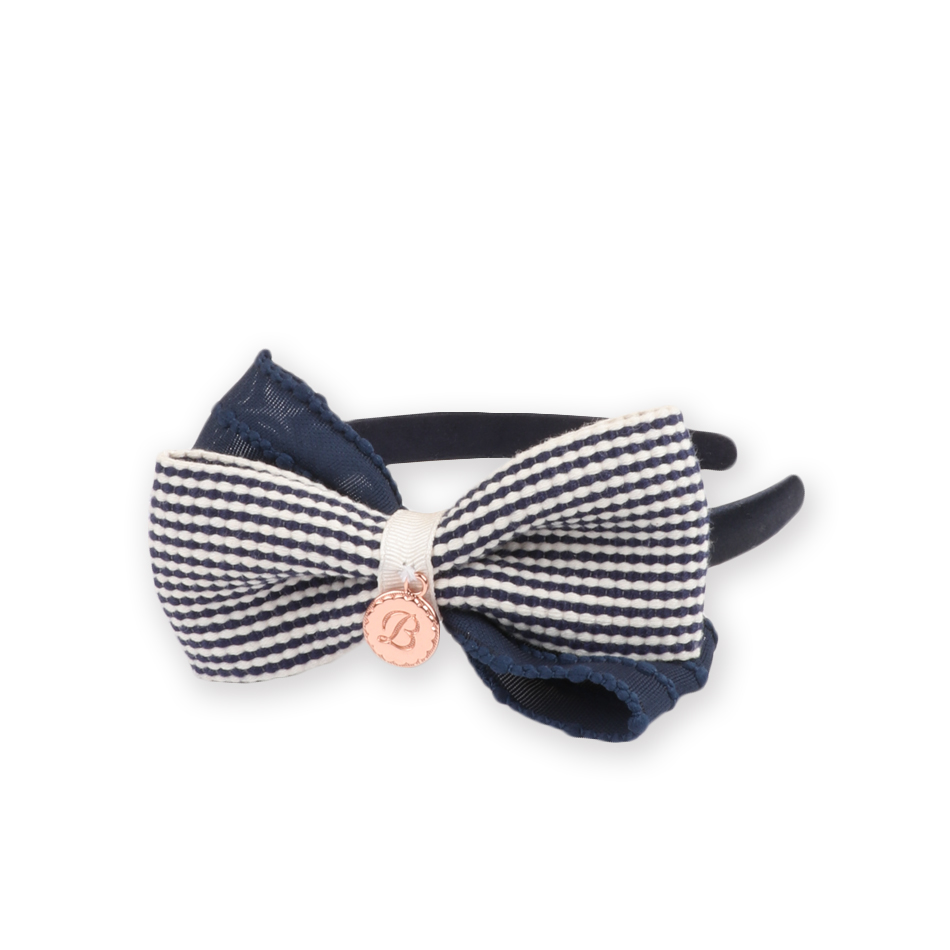 아이보리 바탕의 네이비 스트라이프 소재의 러블리한 쉬폰 소재의 네이비 리본을 교차시켜 만든 여아 머리띠 입니다.