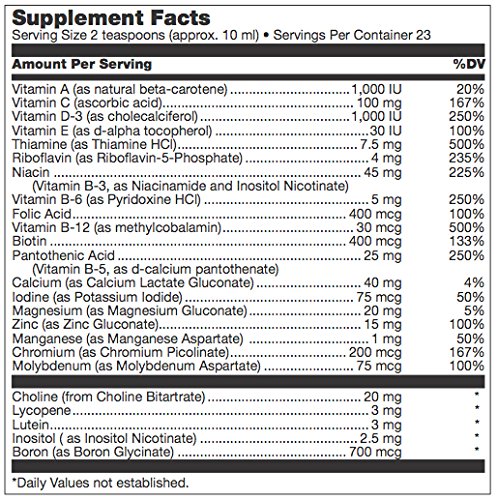 Liquid Multivitamin, provided by Douglas Laboratories, supplies essential vitamins, minerals and trace elements in a great tasting, easy to take liquid supplement. The naturally orange-mango flavored liquid contains no yeast, corn, wheat or sugar and is sweetened with purified stevia extract.