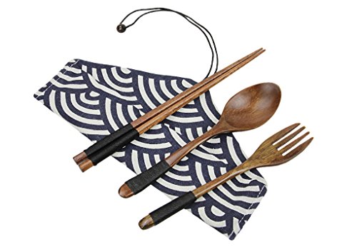 YNICESHOP 목제 젓가락 스푼 포크 젓가락대를 붙어라 4점 세트 도시락 젓가락 휴대 젓가락 카레 스푼 커트러리 세트 미끄럼방지 디자인 수납 편리 휴대 쉽 소풍 캠프 아웃도어 등산 낚시 여행 용