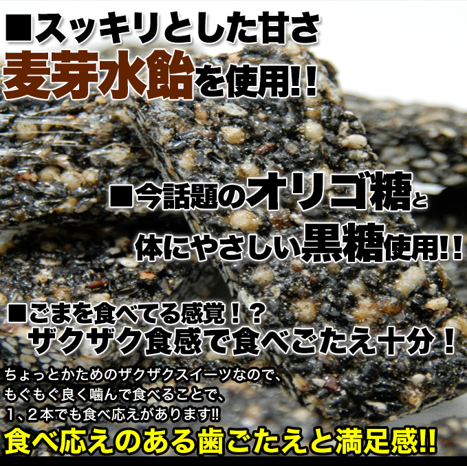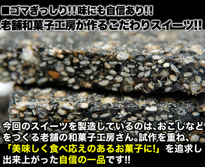 ●原材料名:胡麻、麦芽水飴、水飴、黒糖、小麦パフ(小麦粉、甘藷澱粉、塩、膨張剤)