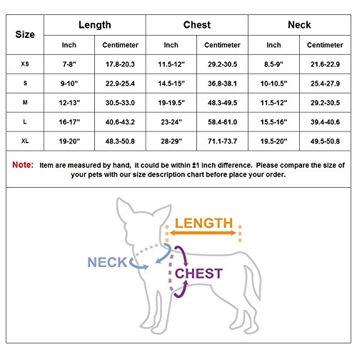 4 Sizes: XS, S, M, L, please compare the size of your puppy with the size chart before you buy, If you're not sure about which size should be taken, please just tell us your pet bust, back length(from neck to base of nail) in cm(or inches).Let's help you to choose the suitable one.