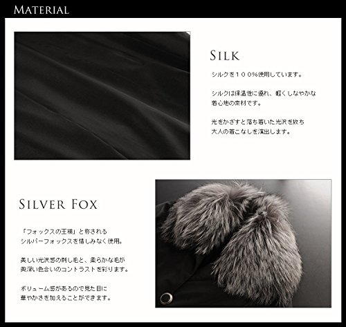 -. Feature : ウィーゼルライナーで暖かなシルバーフォックス衿付きシルクコート。 ボリュームあるシルバーフォックスが、シンプルなシルクのコートに高級感をプラス。 内側のライナーは保温性抜群で柔らかなウィーゼルを使用しており、ボタンとファスナーでの取り外しが出来ます。 / ■サイズ 【M】着丈98cm/胸周り100cm/肩幅39cm/袖丈62cm 【L】着丈99cm/胸周り104cm/肩幅40cm/袖丈63cm 【LL】着丈100cm/胸周り108cm/肩幅41cm/袖丈64cm 重量:1180g 素材:シルク/ウィーゼル/ロシアンリス 留め具:ボタン×4 ポケット 左右に1ヶ所ずつ 備考 ・衿のシルバーフォックスは取り外せません。 ・ベルトループが2ヶ所に付いています。 / 生地:シルク100% ライナー:ウィーゼル トリミング:シルバーフォックス / ウィーゼルのライナーはファスナーとボタンで付け外しができます。 シルクのベルトが付属しています。 ベルトループが2ヶ所に付いています。 衿のシルバーフォックスは取り外せません。 / (No. 104178 r )