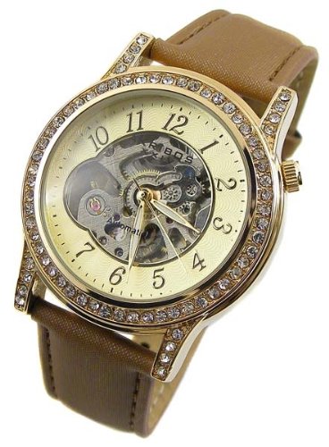 -. Feature : This akribos xxiv ladies timepiece showcases a skeleton automatic moevement / Bezel encased with clear genuine crystals / Genuine calfskin leather brown strap with a satin finish / Cream dial with hydraulically pressed guilloche herringbone design / Not water resistant