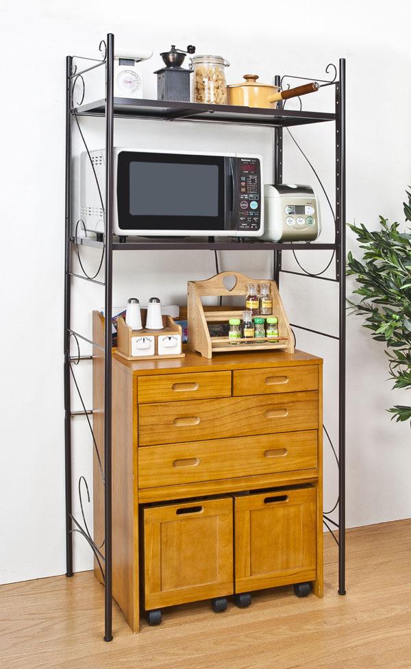 | ワイヤーフレームがエレガントな伸縮式キッチンラックです。ごみ箱やワゴンの上にも収納をプラス。幅もぴったりに設置できる伸縮式。全体耐荷重は余裕の60kg。丈夫なつくりです。棚の高さは4.5cmピッチで移動可能。奥行きもタップリありますので、家電もラクラク置けます。 |