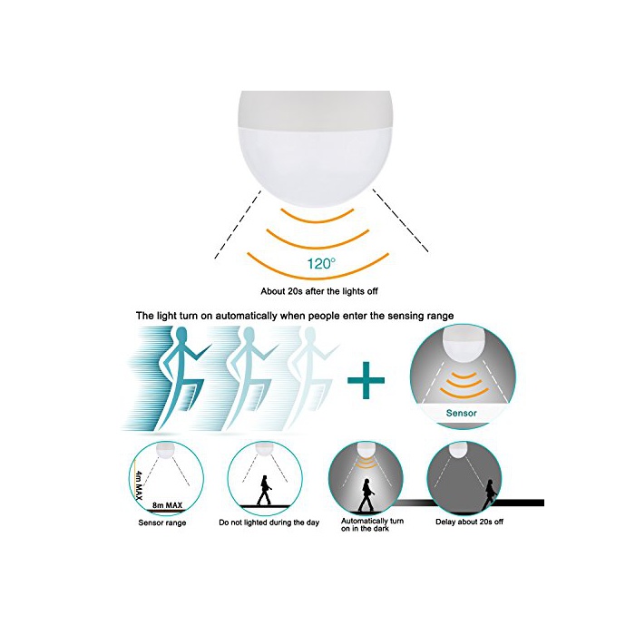 사양:사이즈:(약)6cm×11cm,빔 각도:270°고, 감지 거리:2-4m,소비전력:5W,물림쇠: E26/E27,전광다발(밝기):400lm,광원색:전구색(2700k)고, 재질:알루미늄이나 폴리 카보네이트