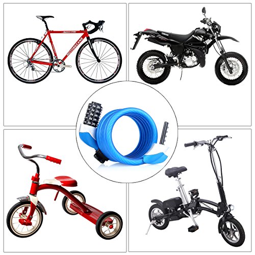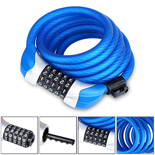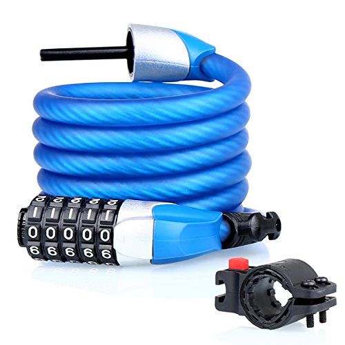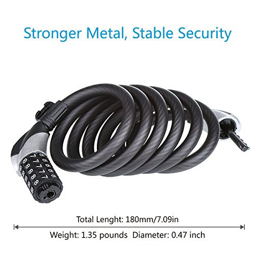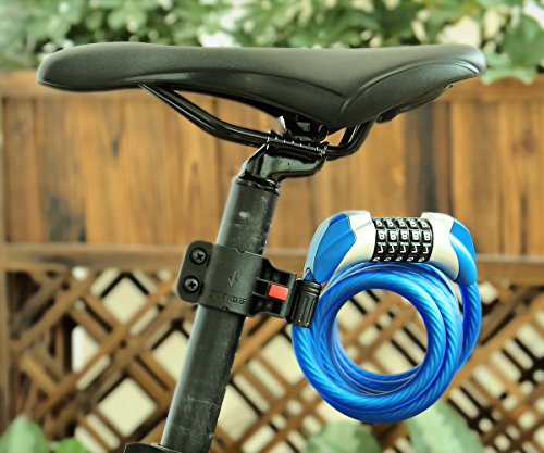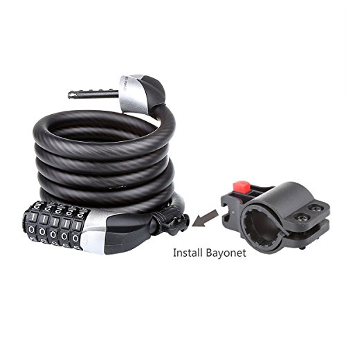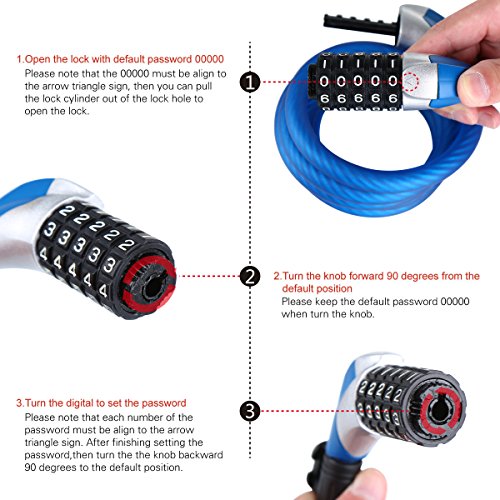-. Feature : Cable Lock with 5-digit Smart Integrated Resettable Combination - The original password is 00000, with indexed number dials for error-free combination setting, it's easy to reset password and open with your personal password. / Cable Lock with Strong Resistance from Saw Cutting Tools and Water- It consist of strong, durable twisted metal cables inside and a transparent coating colored rubber outside. What's more, the lock pin was made from waterproof metal. / Cable Lock with Heavy Duty Military Grade Braided Steel to lock up bicycle, scooter, grills and other items that need to be secured- The length of the cable lock is 6 Feet (1.8m), and the diameter is 12mm, long and thick enough for your use. / Cable Lock with Felxilbe Mount to hold the Calble Lock on your bike- The lock comes with a mount for your bike so you can easily take this with you, without needing a backpack or basket to carry it. / Cable Lock will not be out of shape even the temperature reachs 40 centigrade with the high quality strong material.