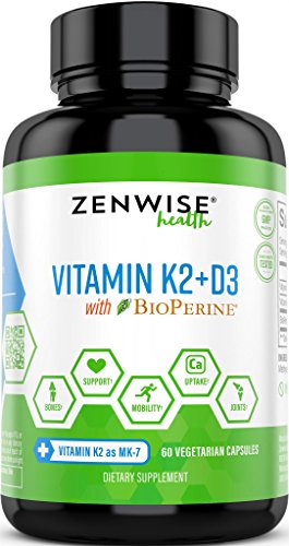 -. Feature : POWERFUL VITAMIN K2+D3 - Zenwise Health Vitamin K2 + D3 contains 5000 IU of Vitamin D3 Cholecalciferol, an active form of Vitamin D that pairs with 100 mcg Vitamin K2 (as MK7) to help the body absorb calcium for bone, joint, and heart support. / ENHANCED WITH BioPerine® - BioPerine® is a patented Black Pepper Extract from black pepper fruits (Piper nigrum) at a standardized minimum of 95% Piperine, which supplements the vitamins K2 and D3 for more bioavailable absorption. / HEALTHY BONE DENSITY - This K2D3 combo is the ultimate osteo solution by directing calcium absorbed through Vitamin D3 straight to your bone mineral matrix to ensure that arteries and joints will not accumulate calcium deposits. / HIP & JOINT SUPPORT - The Menaquinone 7 form of Vitamin K2 in this complex may help reduce sore, swollen, and aching joint pain for relief and comfort, while also promoting flexible movement, comfort, and mobility for an active lifestyle. / CARDIOVASCULAR HEALTH - Vitamin K2 may optimize arterial flexibility and reducing high deposits of calcium in the cardiovascular system. This Vit K2-MK7 in this supplement may help guard the heart for proper elasticity.