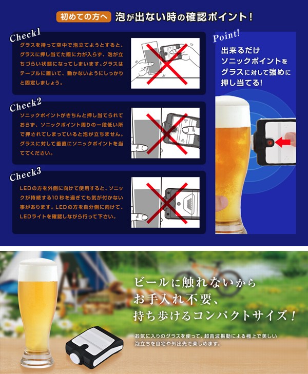 | ◆ビール、グラスは別売りです。市販のものを別途ご用意ください。 ◆超音波を人体や生き物に当てるなど、本来の目的以外の用途には絶対に使用しないでください。取扱説明書をお読みのうえ、正しくお使いください。 ※画像はイメージです。実際の商品と多少異なる場合がございます。 ※仕様やデザインは改良のため、予告なく変更される場合があります。 |