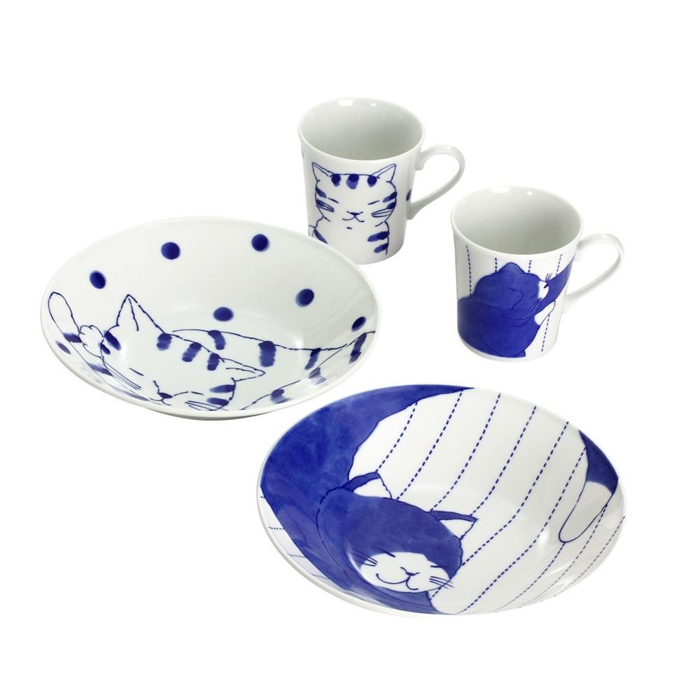 白磁に藍色で描かれた猫が可愛いペアマグ&プレート。