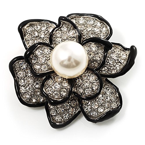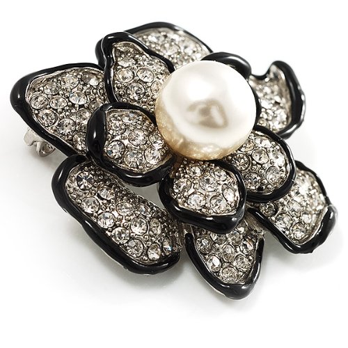 -. Title : Bridal Synthetic Pearl Crystal Flower Brooch (Black & Silver)