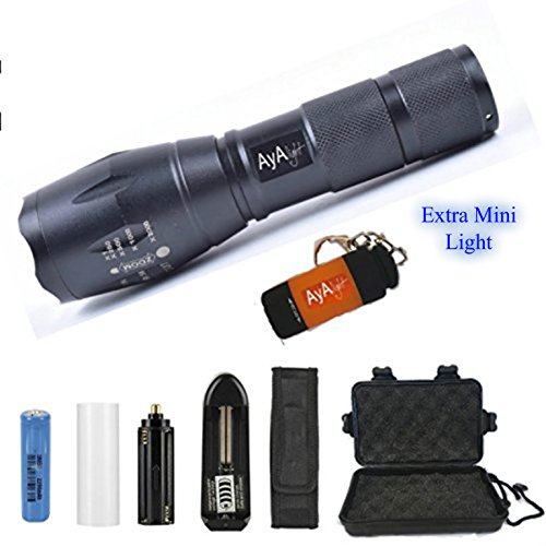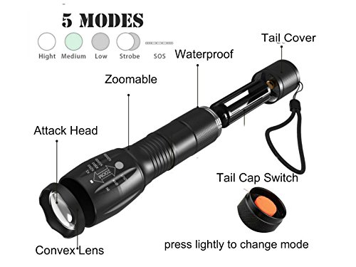 - *Reliable rechargeable tactical LED flashlight for emergencies as well as leisure time + everyday use *Battery + sleeve,charger, AAA holder(batteries not included),holster,mini flashlight,carry case *Zoomable focus, water and shock resistant,comfortable hold,5 modes: High -Mid-Low-Strobe-SOS *Perfect gift for adventurer friend/family member; 5-1/2 x 1-1/3 x 1 Inches; 4.75 Ounces; Color:Black *Read a map in the dark,use as emergency weapon to ward off attack,get attention from a rescue team