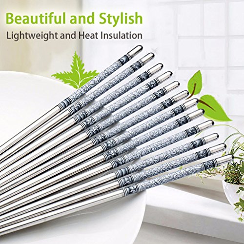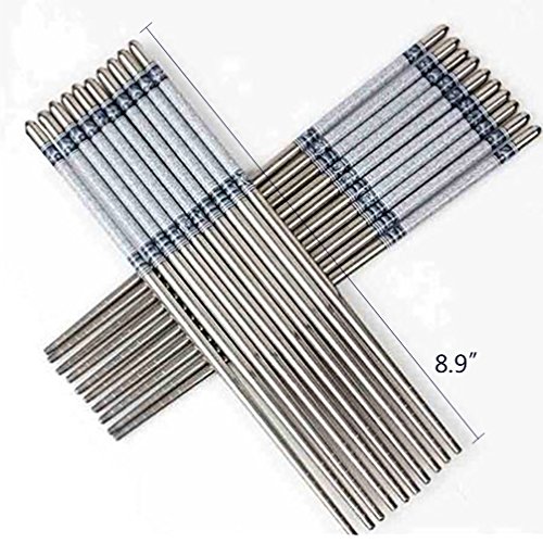 - Size and Package: The length of our metal steel chopsticks is approx 9.0 inches. The item includes 5 pairs which is suitable for family. It's a nice dishware for your daily use to have dinner. Unique and exquisite design, you will not feel tired after long time use. Enjoy the good life easily!