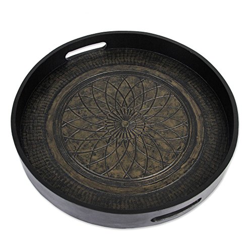NOVICA Wood and leather serving tray, Black Andean Lotus