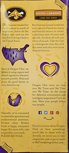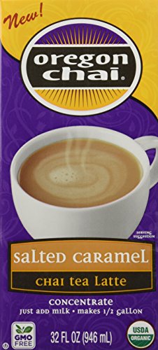 -. Binding : Grocery -. Brand : Oregon Chai -. Feature : Salted Caramel is a smooth blend of robust caramel with a hint of sea salt that lasts to the bottom of every cup -. Label : Kerry Group -. Manufacturer : Kerry Group -. NumberOfItems : 6 -. PackageQuantity : 1 -. ProductGroup : Grocery -. ProductTypeName : GROCERY -. PublicationDate : 2015-07-30 -. Publisher : Kerry Group -. ReleaseDate : 2015-07-30 -. Size : 32 Ounce -. Studio : Kerry Group -. Title : Oregon Chai Salted Caramel Tea Latte, 32 Ounce (Pack of 6)